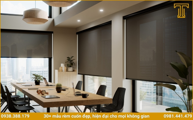 Hầu hết các loại rèm cuốn được làm từ vải polyester phủ nhựa PVC hoặc các chất liệu chuyên dụng khác, có khả năng cản sáng gần như 100%. Điều này giúp ngăn chặn ánh nắng chói trực tiếp, giảm độ lóa trên màn hình máy tính, TV, bảo vệ thị lực và tăng cường sự tập trung cho công việc.