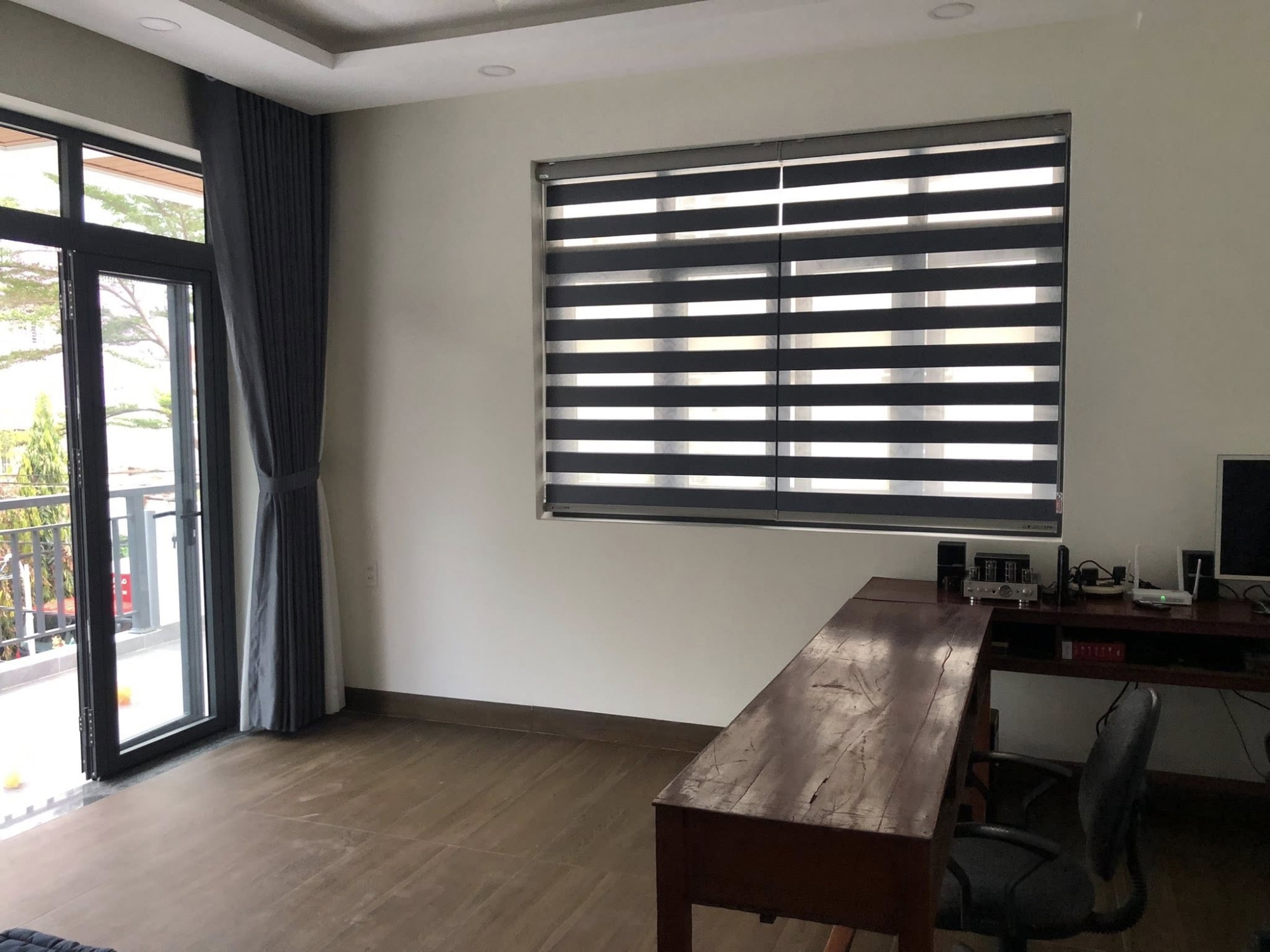 Khi hai lớp vải được kéo để các vân cùng loại khớp với nhau, rèm đóng hoàn toàn hoặc mở hoàn toàn. Khi kéo so le, các vân xuyên sáng và cản sáng xen kẽ tạo hiệu ứng thị giác như những dải cầu vồng nằm ngang – vừa đẹp mắt vừa điều tiết ánh sáng hoàn hảo.
