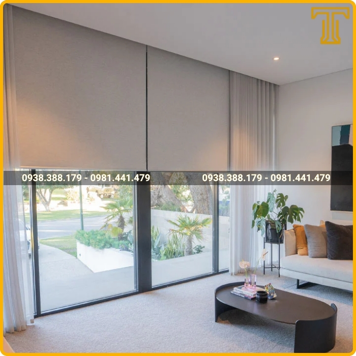 Hầu hết các loại rèm cuốn được làm từ vải polyester phủ nhựa PVC hoặc các chất liệu chuyên dụng khác, có khả năng cản sáng gần như 100%. Đây là giải pháp lý tưởng để ngăn chặn ánh nắng gay gắt, giúp phòng khách luôn mát mẻ và dịu mắt, rất phù hợp cho những ngôi nhà hướng Tây hoặc những không gian có cửa kính lớn.