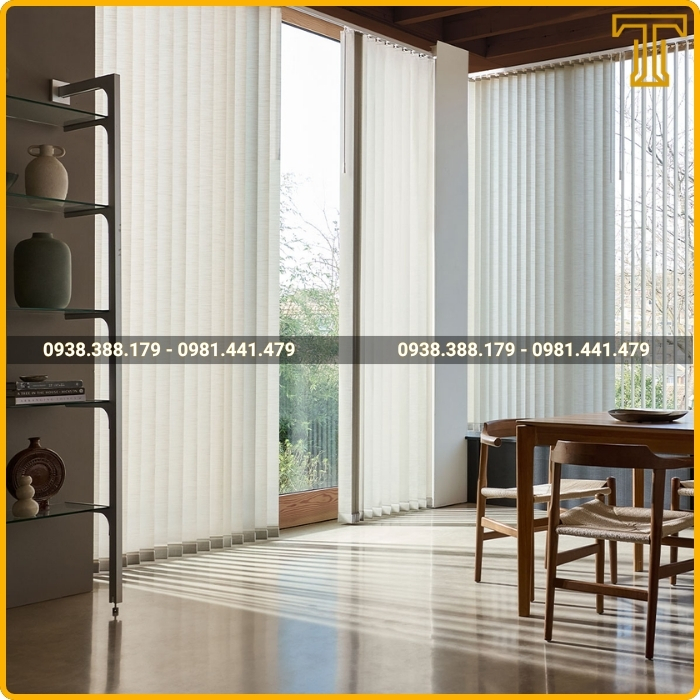 Rèm lá dọc có vẻ ngoài thanh lịch, chuyên nghiệp với các lá rèm buông thẳng. Rèm không chỉ phù hợp với các ô cửa sổ nhỏ mà còn là lựa chọn hoàn hảo cho các cửa kính lớn, vách kính của văn phòng. Sự đa dạng về màu sắc cũng giúp rèm lá dọc dễ dàng hài hòa với mọi phong cách thiết kế, tạo nên một không gian làm việc sang trọng và tinh tế.