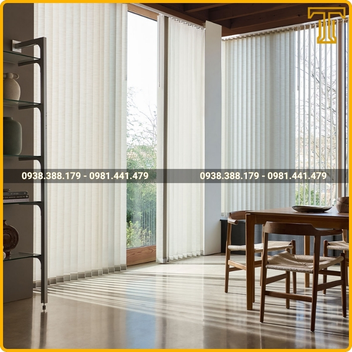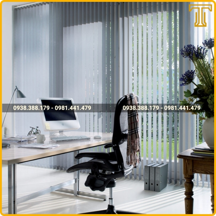 Rèm lá dọc có vẻ ngoài thanh lịch, chuyên nghiệp với các lá rèm buông thẳng. Rèm không chỉ phù hợp với các ô cửa sổ nhỏ mà còn là lựa chọn hoàn hảo cho các cửa kính lớn, vách kính của văn phòng. Sự đa dạng về màu sắc cũng giúp rèm lá dọc dễ dàng hài hòa với mọi phong cách thiết kế, tạo nên một không gian làm việc sang trọng và tinh tế.