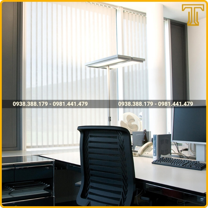 Phòng làm việc tại các tòa nhà cao ốc thường có cửa kính lớn, đón lượng ánh sáng mặt trời đáng kể. Rèm lá dọc cao cấp với khả năng cản sáng gần như 100% sẽ giúp ngăn chặn ánh nắng chói trực tiếp, giảm độ lóa trên màn hình máy tính, bảo vệ thị lực và tăng cường sự tập trung cho nhân viên.