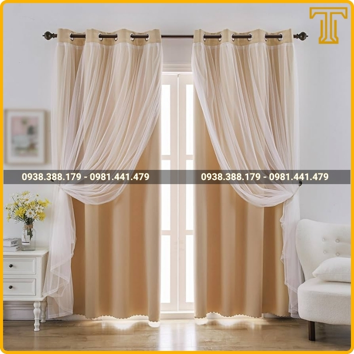 Đây là lựa chọn phổ biến và tối ưu nhất cho phòng ngủ và phòng khách chung cư. Rèm bao gồm một lớp vải Poly dày để cản sáng, chống nắng và một lớp voan mỏng bên trong để trang trí, làm dịu ánh sáng.