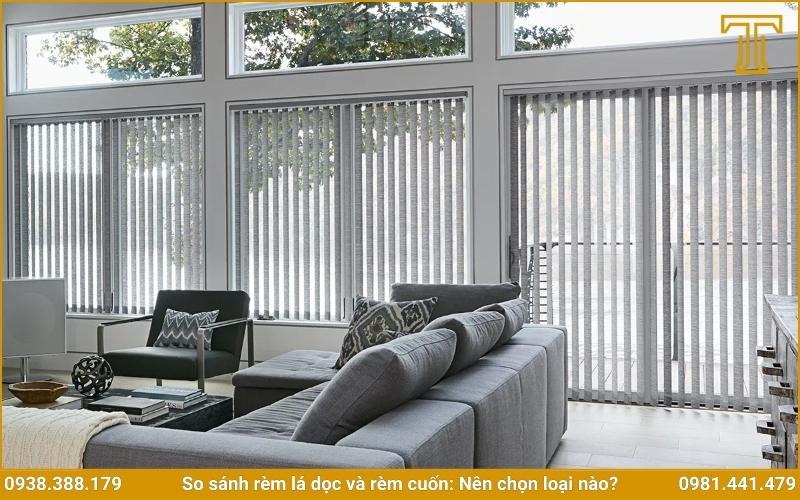 Rèm lá dọc: Là loại rèm được cấu tạo từ các lá rèm bản rộng được sắp xếp theo chiều dọc. Rèm hoạt động theo cơ chế xoay lật các lá rèm 180 độ, giúp điều chỉnh ánh sáng một cách linh hoạt. Rèm lá dọc mang vẻ đẹp thanh lịch, chuyên nghiệp và rất phù hợp với các ô cửa kính lớn.